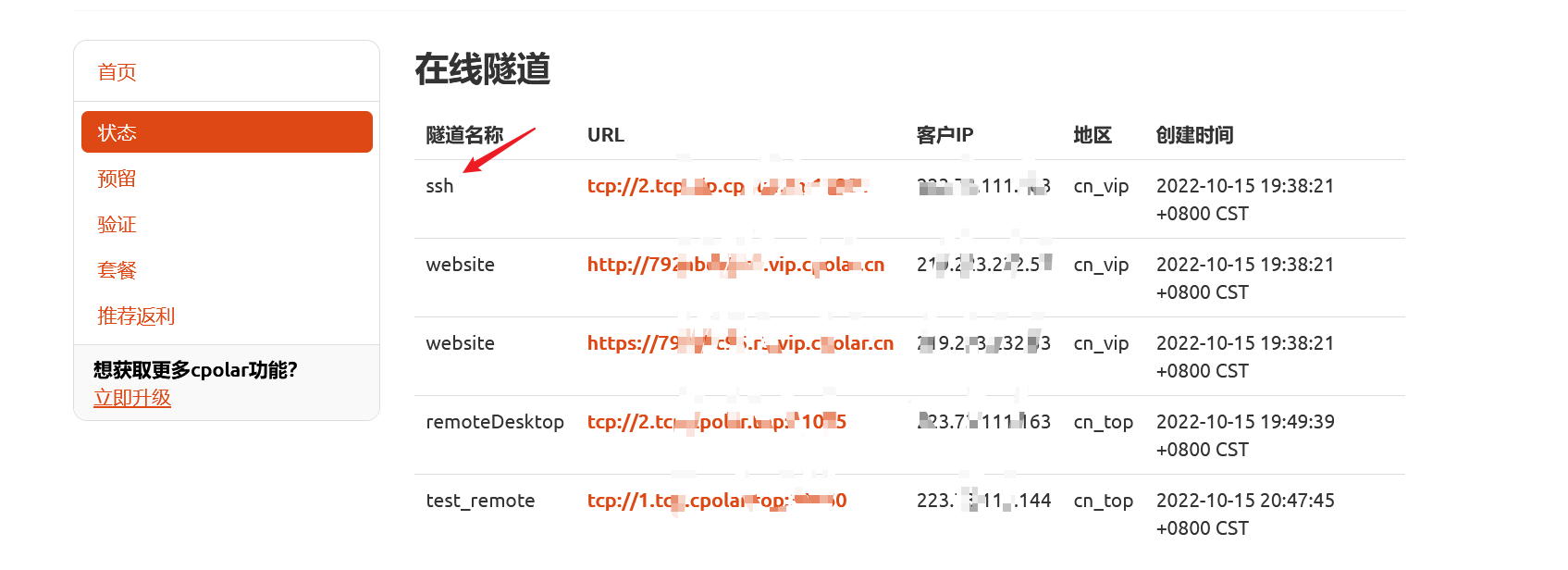 启动成功后,登录cpolar官网后台查看状态,可以查看到所有在线隧道的公网地址,找到SSH隧道的公网地址,复制下来。